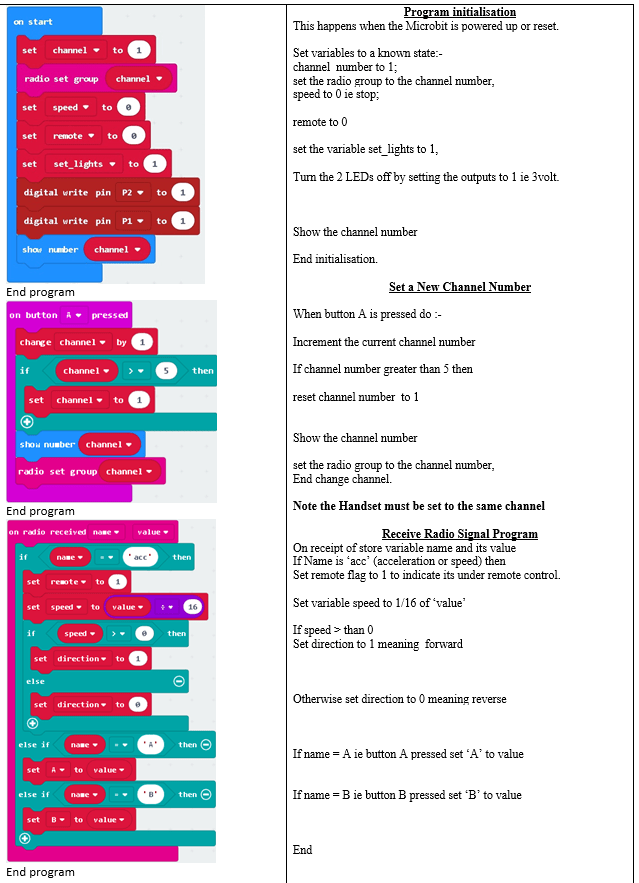 The control handset contains two programs 1- Pendulum timer and 2 the remote control for the car. A description of the program initialisations and Remote Control section is given below. The pendulum timer is described elsewhere.